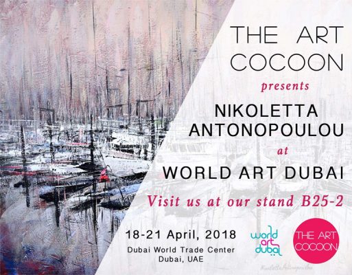 Η γκαλερί The Art Cocoon θα συμμετάσχει για τρίτη συνεχή χρονιά στο World Art Dubai art fair, που θα πραγματοποιηθεί μεταξύ 18 και 21 του Απρίλη, 2018, στον εκθεσιακό χώρο του Dubai World Trade Centre. Η γκαλερί θα παρουσιάσει έργα τεσσάρων σύγχρονων εικαστικών από Ελλάδα και Κύπρο, Χρύσα Βέργη (γ.1959, Ελλάδα), Νικολέττα Αντωνοπούλου (γ.1955, Ελλάδα), Κατερίνα Σταύρου (γ.1989, Κύπρος), Σιμώνη Συμεωνίδου(γ.1983, Κύπρος)